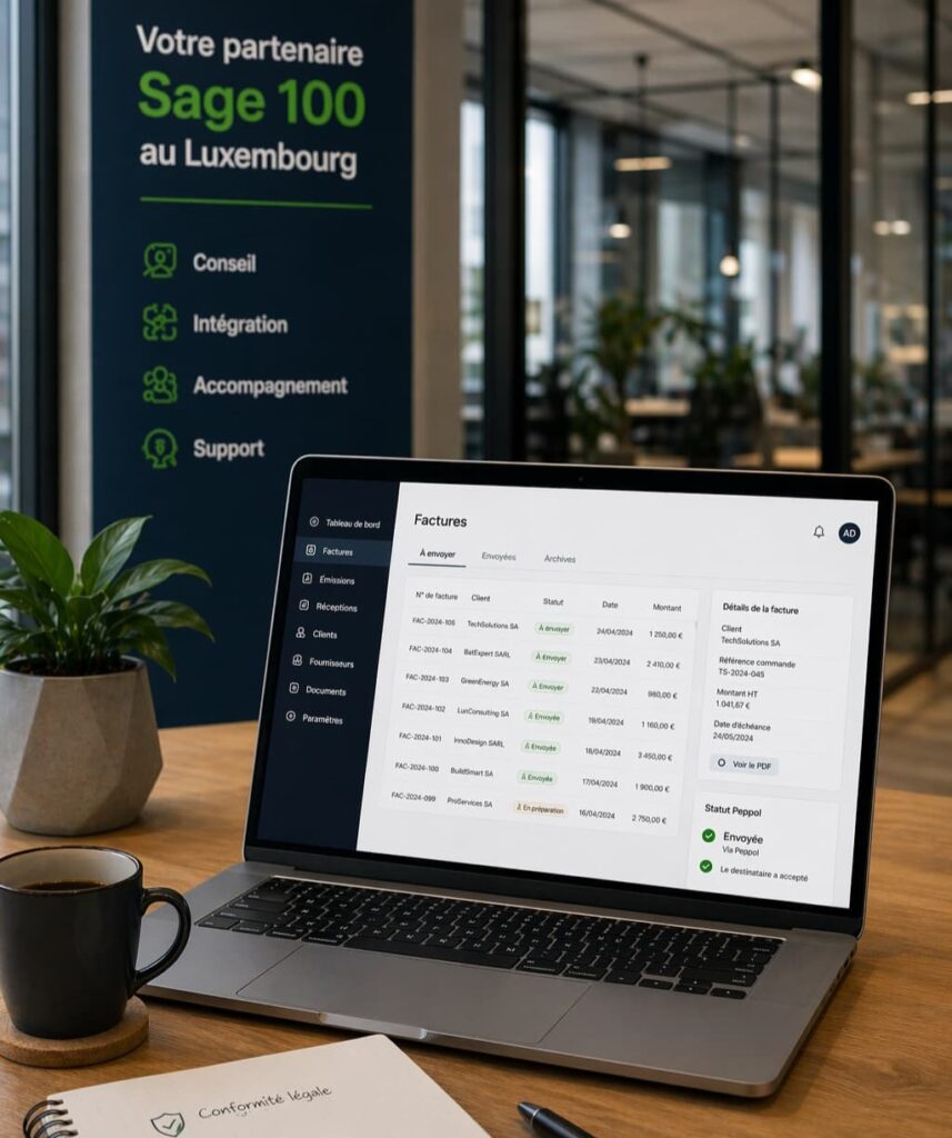 Votre entreprise sera ainsi en mesure de générer des factures dématérialisées répondant aux normes définies par l’Europe, à la loi du 13 décembre 2021 modifiant la loi du 16 mai 2019 relative à la facturation électronique au Luxembourg, ainsi qu’à la législation belge imposant la facturation électronique obligatoire depuis le 1ᵉʳ mars 2024 (B2G) et à partir du 1ᵉʳ janvier 2026 (B2B).